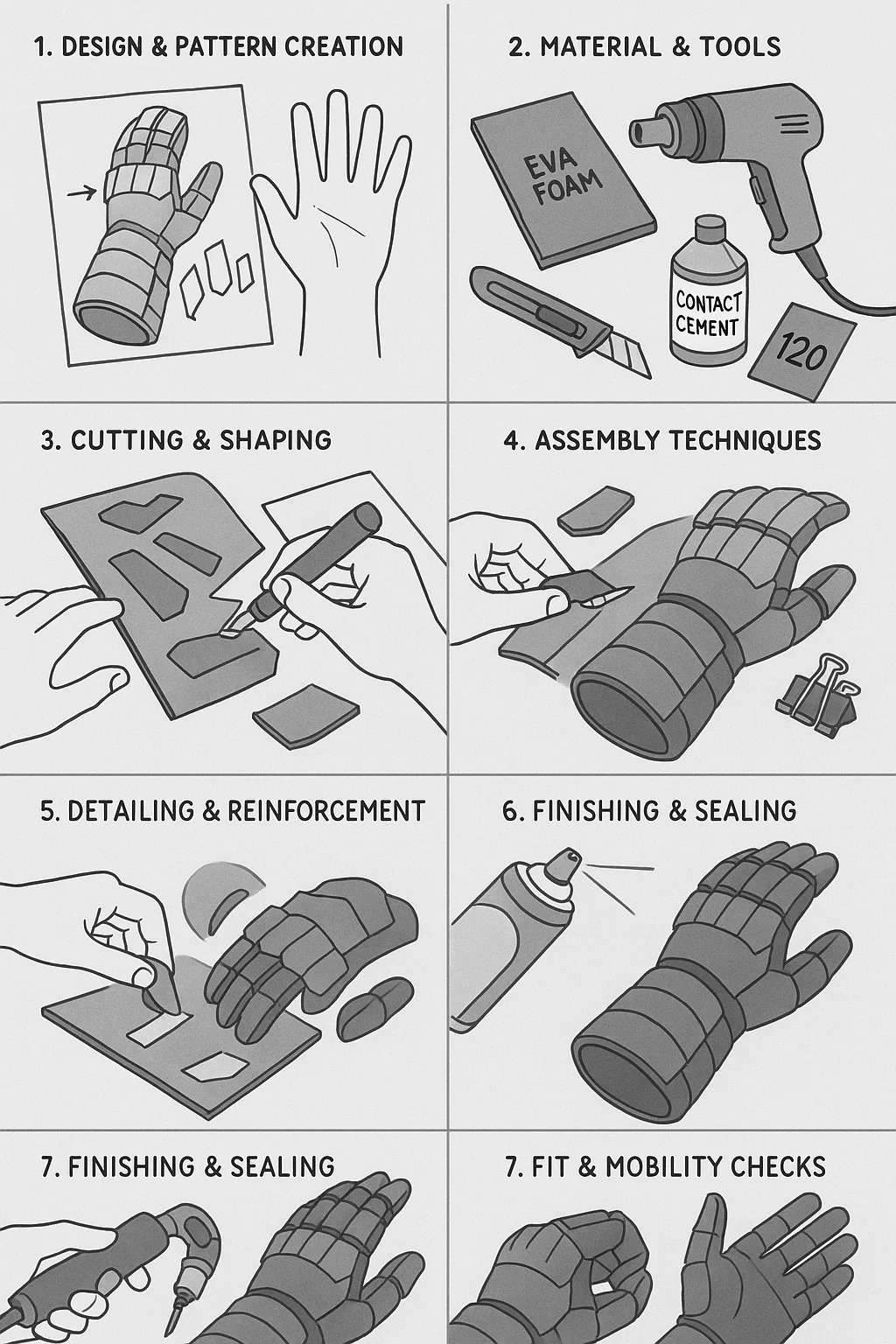 EVAの作成 泡手袋 またはガントレットは、コスプレ、LARP、またはコスチューム プロジェクトで人気のある方法です。プロセスの実際的な内訳は次のとおりです。