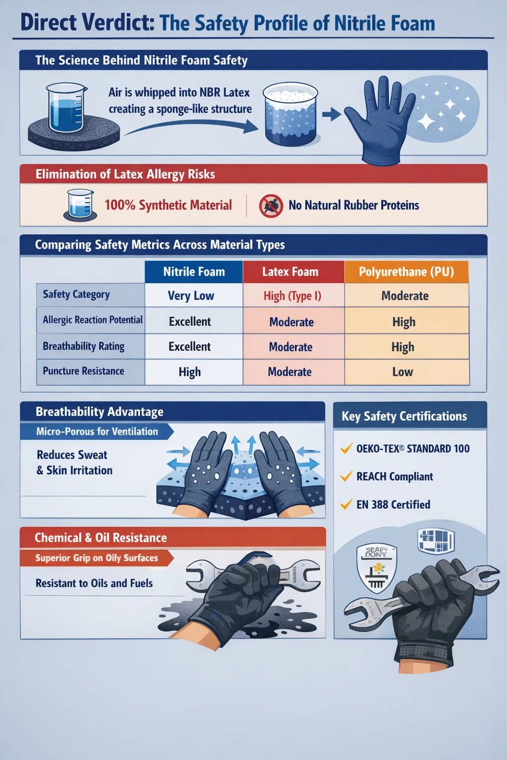 の安全性を理解する ニトリルフォーム ポリウレタン (PU) やラテックスなどの他の一般的なコーティング材料との比較が必要です。以下の表は、ユーザーの健康と保護の観点からニトリルがどのように優れているかを示しています。