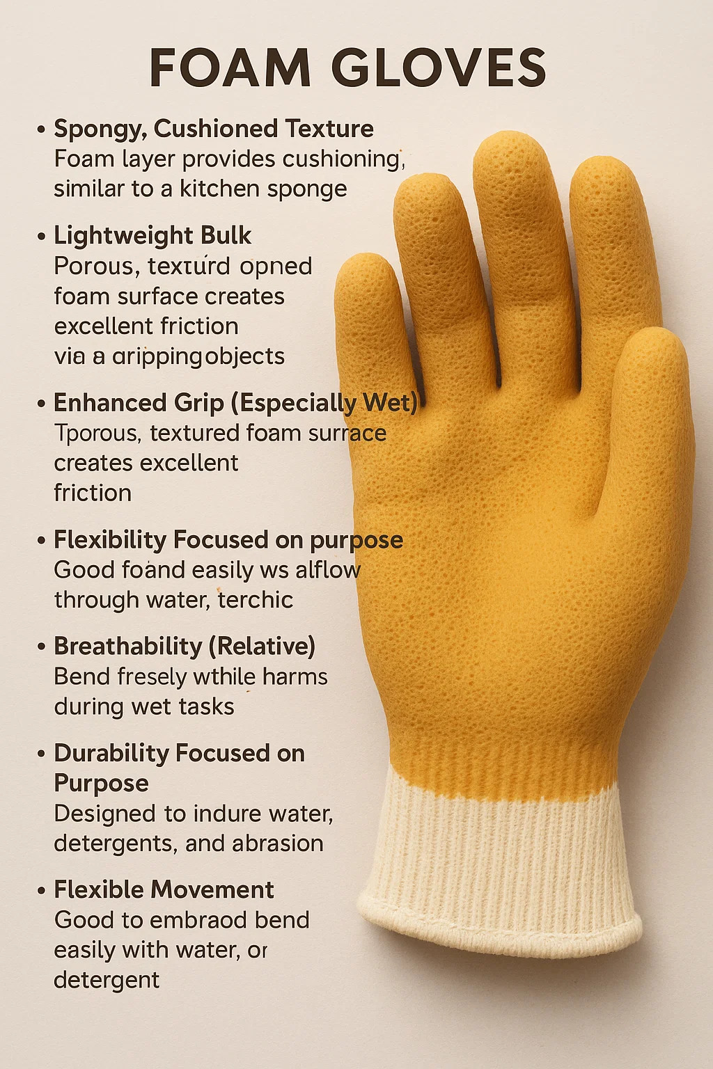 フォーム手袋 独自の材料構造と機能特性によって定義されます。主な特徴は次のとおりです。