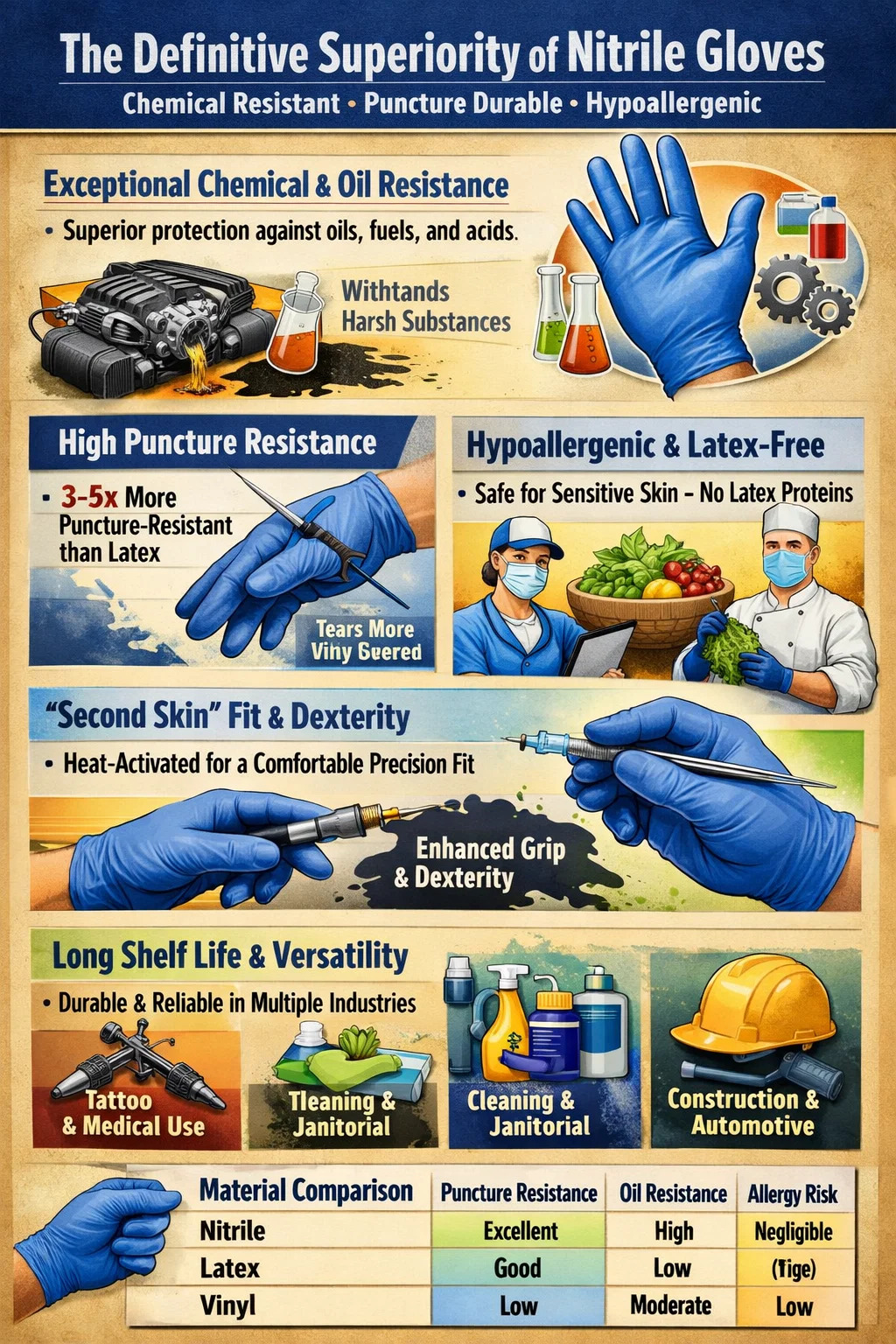 で タトゥー業界 、インクの汚れを隠し、プロセス中に使用されるワセリンに耐性があるため、黒色ニトリルが推奨されます。で 清掃員の仕事 、安価なビニール手袋に簡単に浸透する漂白剤やアンモニアベースのクリーナーから保護します。この多用途性は、ニトリルが単なる使い捨ての選択肢ではなく、安全のための特別なツールであることを証明しています。