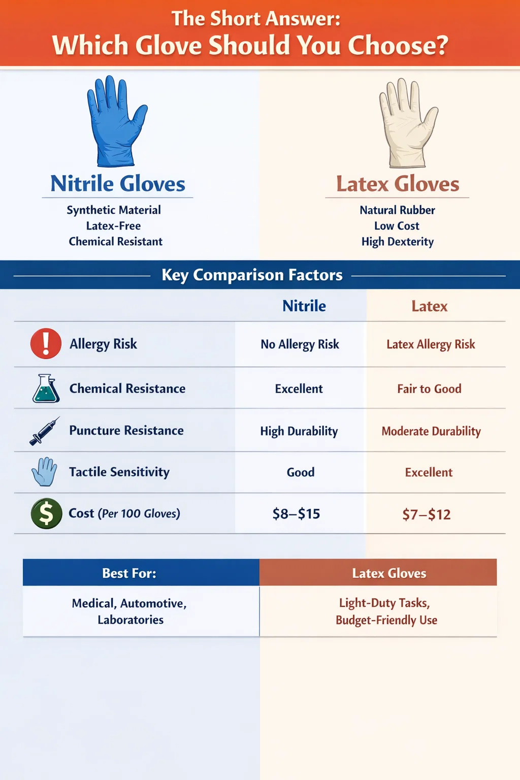 これらは本物ですが、比較的狭い使用例です。ほとんどの用途とユーザーにとって、アレルギーへの安全性、耐薬品性、競争力のある価格の組み合わせにより、ニトリル手袋がより実用的なデフォルトの選択肢となっています。