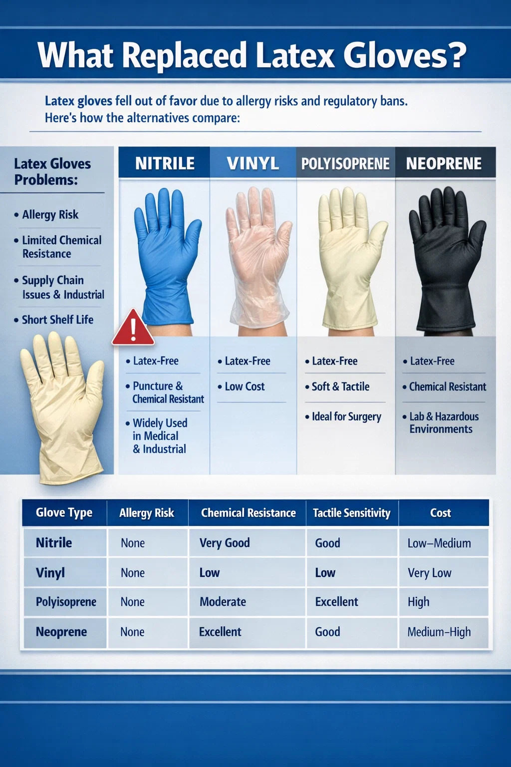 直接的な答えをお探しの場合は、現在、ほとんどの業界でニトリル手袋がラテックス手袋の有力な代替品となっています。病院、歯科医院、食品加工工場、自動車工場のいずれにおいても、ニトリルはラテックスに代わって手袋の素材として選ばれています。この変化は、医療従事者のラテックスアレルギー率が憂慮すべきレベルに上昇した 1990 年代に加速し始めました。一部の研究では、感作率が 定期的に曝露されている医療従事者のうち17% 。それ以来、メーカー、規制当局、調達チームはラテックスフリーの代替品をますます好むようになりました。