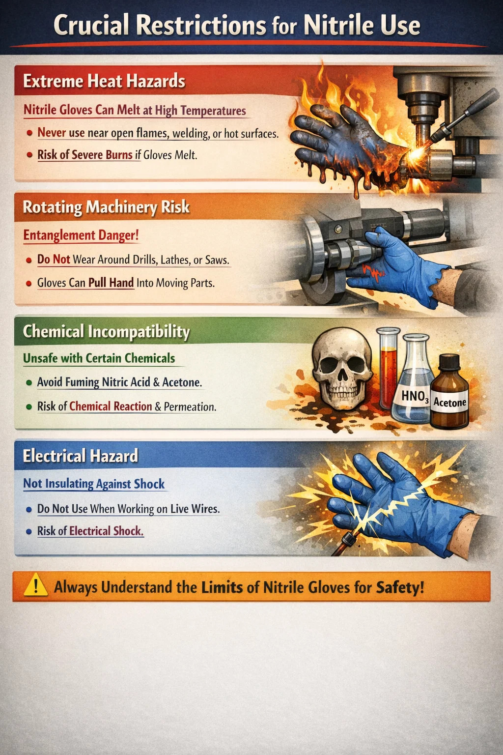 その間 ニトリル手袋 は多くの業界にとってゴールドスタンダードであるため、そうすべきです 裸火で作業するとき、酸化性の高い酸を扱うとき、または回転動力機械を操作するときは着用しないでください。 。これらの手袋は本質的にプラスチック (合成ゴム) の一種です。高温になると溶けて皮膚に密着し、回転するモーターや旋盤に手が引き込まれるのを防ぐのに必要な「離脱」強度が不足します。これらの境界を理解することは、職場の安全にとって不可欠です。